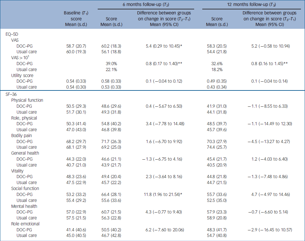 Interviewers, who for practical reasons could not be kept totally unaware of the treatment assignment, assessed participants at baseline (within 2 weeks of the DOC–PG or usual care intervention) and at 6 months and 12 months after the baseline measurement. All outcome measures (except the Mini-Mental Scale Examination (MMSE)) were collected through personal interviews with the patient's proxy (i.e. we measured the proxy's perception of the patient's health). The HRQoL of the patient and the carer was the primary outcome of this study. Because we expected that the patients would show a complex range of mental, physical and social problems, we chose to use the EQ–5D to measure HRQoL. This instrument has been validated in a number of European countries including The Netherlands Reference Brooks8 and provides a simple descriptive profile and a single index value for health status. It is widely used in cost–utility analyses. Reference Dolan9,Reference Kind, Brooks, Rabin and Charro10 The EQ–5D consists of a scale, VAS, ranging from 0 (worst imaginable health state) to 100 (best imaginable health state). Change in VAS scores over the course of 1 year was the primary outcome variable in this study. A difference of 10% or more between the intervention group and the control group on the VAS was a priori considered to be a clinically relevant difference, as described in the original protocol that preceded the start of the study. The number of patients experiencing this clinically relevant difference were compared between both groups.