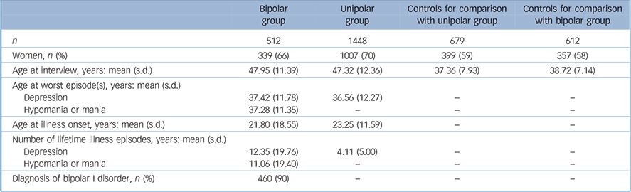 The sample were recruited for two case–control genetic association studies, one focused on unipolar depression Reference Cohen-Woods, Gaysina, Craddock, Farmer, Gray and Gunasinghe21 and the other focused on bipolar disorder. Reference Schosser, Schloegelhofer, Fuchs, Stojanovic, Mossaheb and Kindler22 There were a total of 512 people with bipolar disorder (bipolar group) and 1448 people with unipolar depression (unipolar group). A total of 1346 controls were recruited for both studies but were selected in the present investigation to match the mean age (plus or minus 1 standard deviation) of the bipolar group (26–49 years, n = 612) and unipolar group (24–49 years, n = 679) at the time of their self-defined worst affective episodes. This was to prevent the confounding effect of age at interview, since we previously reported a negative association between age at index period and number of life events in this sample. Reference Hosang, Korszun, Jones, Jones, Gray and Gunasinghe1 The demographic and clinical characteristics of the participants are presented in Table 1.