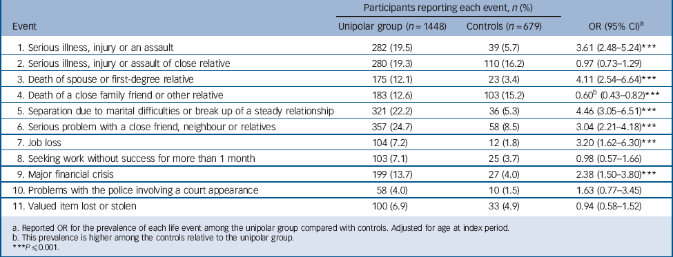 a. Reported OR for the prevalence of each life event among the unipolar group compared with controls. Adjusted for age at index period.
