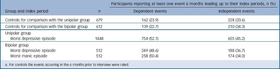 A significantly greater proportion of participants in the unipolar group reported experiencing at least one dependent and independent life event 6 months before their worst depressive episode compared with controls for the 6 months prior to their assessment (Tables 3 and 4).