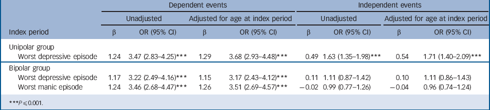 A significantly greater percentage of participants in the unipolar group reported experiencing an independent event prior to their worst depressive episode relative to the bipolar group prior to the worst affective episodes (bipolar disorder worst depressive episode: OR = 1.41, 95% CI 1.11–1.77, Ples;0.01; worst manic episode: OR = 1.59, 95% CI 1.26–2.02, Ples;0.001). Events classified as dependent were reported by a similar proportion in both groups prior to their worst affective episodes (bipolar disorder worst depressive episode: OR = 1.11, 95% CI 0.89–1.40; worst manic episode: OR = 1.02, 95% CI 0.82–1.28, P was not significant for either).
