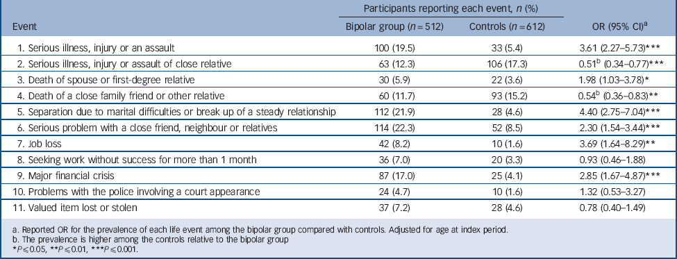 Findings from the present investigation also showed that six events were recorded by significantly more participants with bipolar disorder before their worst depressive episode compared with controls for the period before their assessment; a similar pattern was observed for the worst manic episode. The events included interpersonal problems, financial difficulties and job loss, which are consistent with existing research. Reference Dunner, Patrick and Fieve7,Reference Kessing, Agerbo and Mortensen12