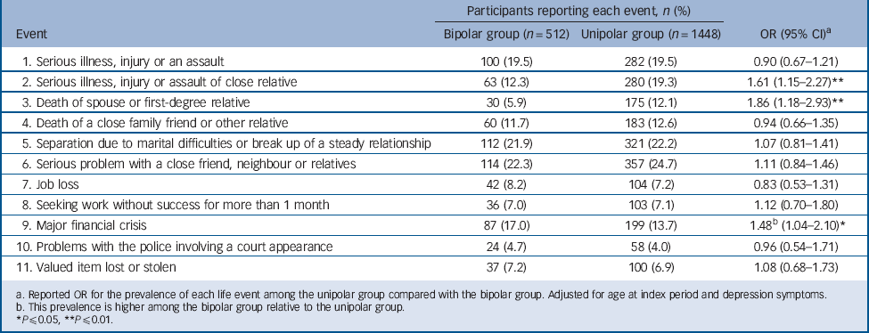 a. Reported OR for the prevalence of each life event among the unipolar group compared with the bipolar group. Adjusted for age at index period and depression symptoms.
