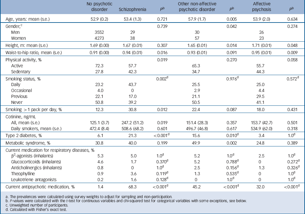 The characteristics for the sample are summarised in Table 1. Both the relatively high mean age and the excess of women in the sample are explained by the fact that the sample is representative of the Finnish population aged 30 years and over with no upper age limit. Self-reported daily smoking and heavy smoking were significantly more common in participants with schizophrenia compared with participants without psychosis. Likewise, participants with schizophrenia had significantly higher serum cotinine (S-Cot) levels compared with participants without psychosis, even after adjusting for age and gender (β = 127.6 ng/mL, 95% CI 31.4–223.9 ng/mL, P = 0.009) in a linear regression model.