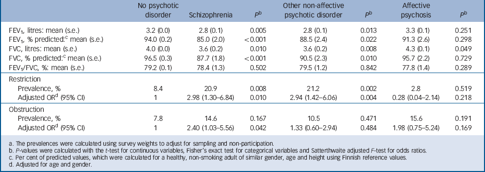 In the regression analysis of spirometry results we were able to account for important potential confounders, such as obesity and diabetes. However, despite the large general population sample, the number of people with psychosis for whom acceptable spirometry results were obtained was too small for meaningful regression analysis of the predictors of low spirometry values solely within this subgroup. We only had information on pneumonia requiring hospital treatment and no data are available for the more common milder forms of pneumonia treated in ambulatory settings. The study sample was confined to the Finnish population and thus the findings may not be directly generalised to other populations. Finally, because of the cross-sectional design of the study, causal inferences cannot be made.