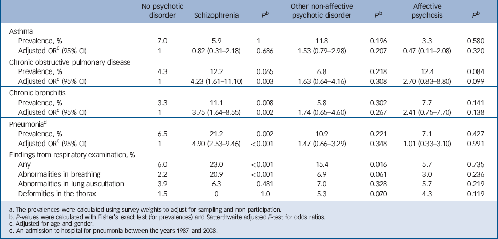 Table 3 Prevalences and adjusted odds ratios for respiratory diseases and symptoms for participants with and without psychotic diosrder a