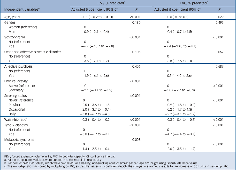 Table 4 Results of multiple linear regression analyses with the spirometry values of the total general population sample as dependent variables and psychotic disorders as independent variables along with potential confounding factors