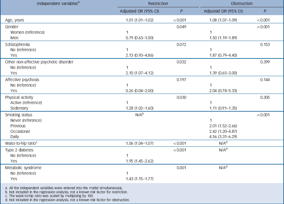 Our results suggest that abdominal obesity, type 2 diabetes, metabolic syndrome and sedentary lifestyle contribute to restrictive lung disease in people with schizophrenia and other non-affective psychoses. However, even after adjusting for these factors, the effect of other non-affective psychoses remained significant, and the effect of schizophrenia nearly significant, suggesting that other factors are also influencing the risk of restrictive lung disease in individuals with these disorders. In conclusion, factors underlying spirometric restriction often remain unclear Reference Guerra, Sherrill, Venker, Ceccato, Halonen and Martinez35 and our cross-sectional study design does not allow any conclusion with regard to causality.