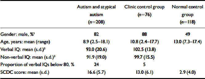 | Autism and atypical autism (n=208) | Clinic control group (n=76) | Normal control group (n=118) | |