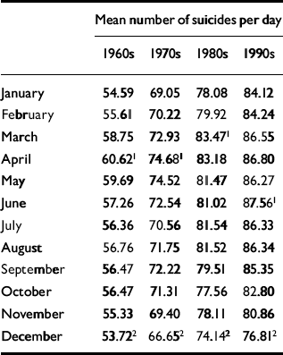 Yip et al (Reference Yip, Chao and Chiu2000) reported that the seasonal variation of suicides in England and Wales had declined in recent decades. This does not appear to be the case in the USA. Monthly data for the number of suicides were available for the period 1960-1998 (National Center for Vital Statistics, 1960-1999; additional data J. McIntosh, personal communication, 2001). Chi-squared tests were conducted for each year for the monthly distribution (correcting for the number of days in each month), and contingency coefficients calculated in order to control for the number of suicides each year. There was no linear trend in the contingency coefficients over the 39-year period (Pearson r=0.033). The month with the peak number of suicides varied over the 39-year period, but not in any linear fashion (see Table 1 for a summary by decade).