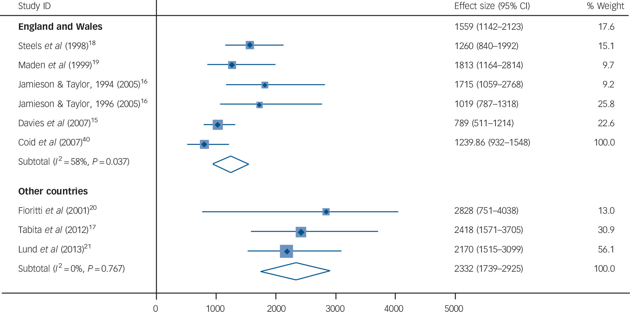 All-cause crude death rates (CDRs) ranged from 789 to 2828 per 100 000 person-years (online Table DS2). The pooled estimate for all-cause CDR was 1538 (95% CI 1175–1901) per 100 000 person-years (I 2 = 71%, 95% CI 41–85%). Subgroup analysis revealed some influence of location on all-cause death rates, with studies based in England and Wales reporting lower mortality (CDR = 1240, 95% CI 932–1548) compared with those from other countries (CDR = 2332, 95% CI 1739–2925) (Fig. 1). Meta-regression was not conducted because of a limited number of samples. As a result of insufficient information in the included studies, standardised mortality ratios (SMRs) were not reported.