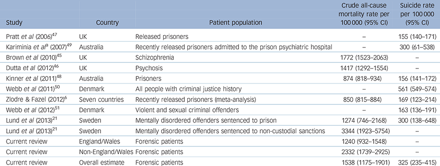 Six studies reporting on mortality in comparative groups were identified: released prisoners, mentally disordered offenders and community psychiatric patients (n = 7 667 645) (Table 1). Reference Zlodre and Fazel6,Reference Lund, Hofvander, Forsman, Anckarsäter and Nilsson21,Reference Brown, Kim, Mitchell and Inskip45–Reference Webb, Qin, Stevens, Mortensen, Appleby and Shaw50 Rates ranged from 850 to 3344 per 100 000 person-years for all-cause mortality, and from 155 to 561 per 100 000 person-years for suicide. The highest all-cause mortality rate was reported in mentally disordered offenders sentenced to non-custodial sanctions, Reference Lund, Hofvander, Forsman, Anckarsäter and Nilsson21 and for suicide, it was all people with criminal justice history. Reference Webb, Qin, Stevens, Mortensen, Appleby and Shaw50