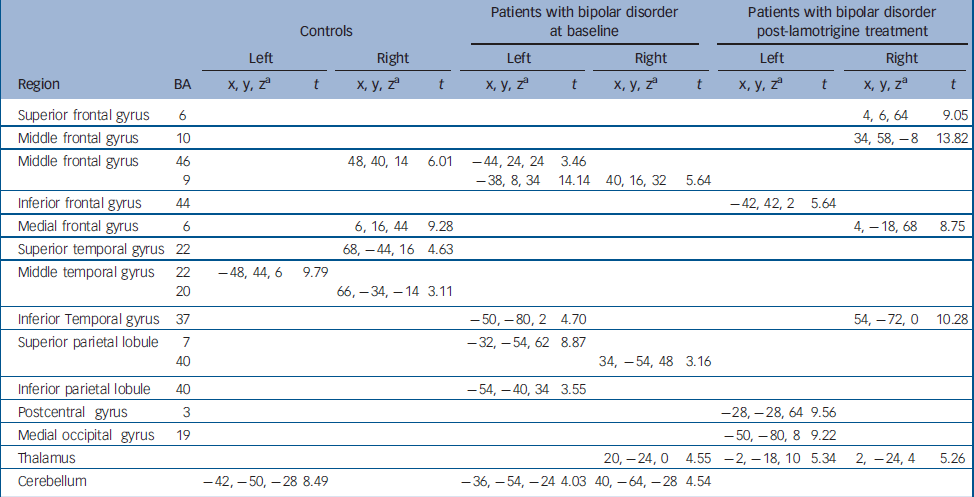 Distribution of brain activation in control participants and patients with bipolar disorder at baseline and post lamotrigine treatment Both groups at baseline displayed activation in the middle frontal gyrus (Brodmann area; BA 46), temporal regions and cerebellum. In addition, controls activated the medial frontal gyrus (BA 6) while patients activated parietal regions. After lamotrigine treatment, patients displayed additional activation in the medial frontal gyrus (BA 6), inferior frontal gyrus (BA 44), postcentral gyrus (BA 3), medial occipital gyrus (BA 19) and the thalamus. Detailed coordinates of the regional peaks are shown in Table 1.