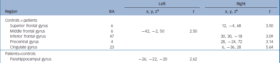 Compared with controls, greater activation was observed in patients in the parahippocampal gyrus. However, controls showed significantly more activation mostly right-sided, in the superior (BA 6) and inferior (BA 47) frontal gyri, and the precentral (BA 4) and cingulate (BA 23) gyri. Additionally, increased activation relative to patients was also seen in the left middle frontal gyrus (BA 6). Detailed coordinates of the regional peaks are shown in Table 2.