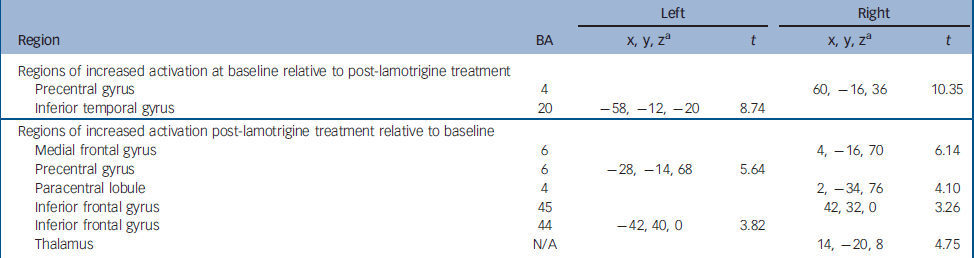 Table 1 Regions of brain activation during sad facial affect recognition at baseline and post-lamotrigine treatment.