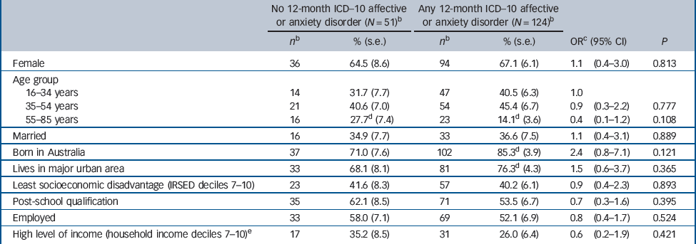 | No 12-month ICD–10 affective or anxiety disorder (N = 51) b | Any 12-month ICD–10 affective or anxiety disorder (N = 124) b | ||||||