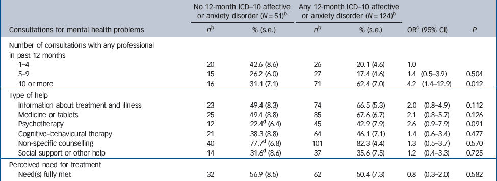 | Consultations for mental health problems | n b | % (s.e.) | n b | % (s.e.) | OR c (95% CI) | P | |