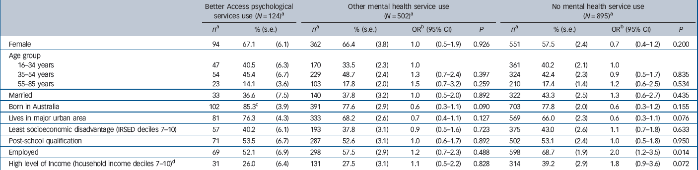 | Better Access psychological services use (N = l24) a | Other mental health service use (N = 502) a | No mental health service use (N = 895) a | |||||||||||||