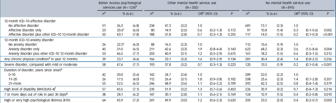 The multivariate multinomial analysis showed, however, that two variables were the key determinants of whether a person with 12-month affective or anxiety disorder was a non-service user, compared with being a Better Access user. These were: lower odds of having a severe disorder (adjusted odds ratio (OR) = 0.3, 95% CI 0.2–0.6, P = 0.002); and lower odds of having a 12-month ICD–10 affective disorder, either alone (adjusted OR = 0.3, 95% CI 0.1–0.8, P = 0.016), or in combination with another disorder (adjusted OR = 0.3, 95% CI 0.1–0.6, P = 0.001), compared with not having an affective disorder. Because the sample for this analysis comprises individuals with an affective or anxiety disorder, respondents in the reference category ‘no affective disorder’ are those who had an anxiety disorder that is not comorbid with an affective disorder.