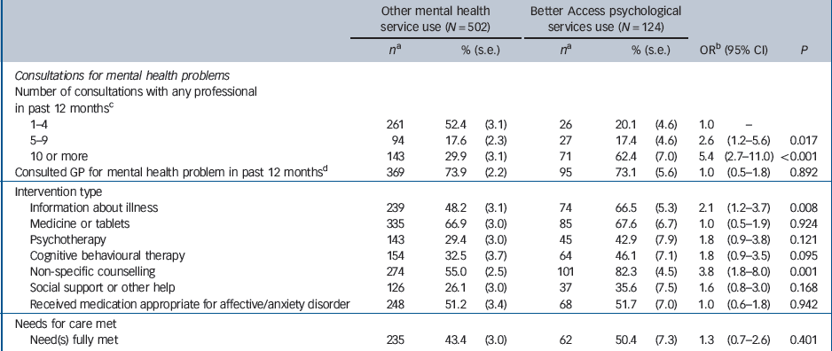 We were also interested in whether service use patterns differed between the Better Access and other service user groups. Binomial logistic regression analyses showed a monotonic increasing association between Better Access service use and number of mental health consultations in the past 12 months. Better Access users also had twice the odds of reporting receipt of information about illness and treatment and almost four times the odds of reporting receipt of non-specific counselling than other service users. There were no significant differences in self-reported rates of receipt of other interventions, including cognitive–behavioural therapy (CBT) (Table 5).