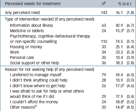 | Perceived needs for treatment | n b | % (s.e.) | |