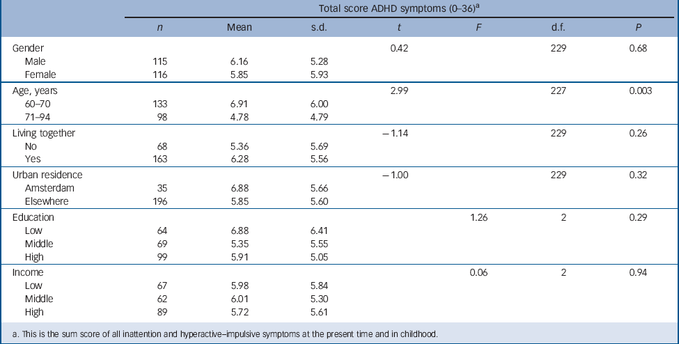 Weighted back to the general population, the prevalence rate of syndromatic ADHD was estimated at 2.8% (95% CI 0.86–4.64) and the prevalence of symptomatic ADHD at 4.2% (95% CI 2.05–6.39) (Table 2). At face value, the prevalence was higher in younger elderly adults compared with older elderly adults (4.0% v. 1.1% for syndromatic and 5.8% v. 2.1% for symptomatic ADHD), but the prevalence rates in the different age groups were not tested for significance owing to the small sample size. However, independent samples t-test showed that younger elderly adults reported significantly more ADHD symptoms (mean 6.91, s.d. = 6.0) than older elderly adults (mean 4.78 (s.d. = 4.79); t(227,3) = 3.00, P = 0.003) (Table 3). There was no significant difference in ADHD symptoms between men and women, by living situation, level of education or level of income.