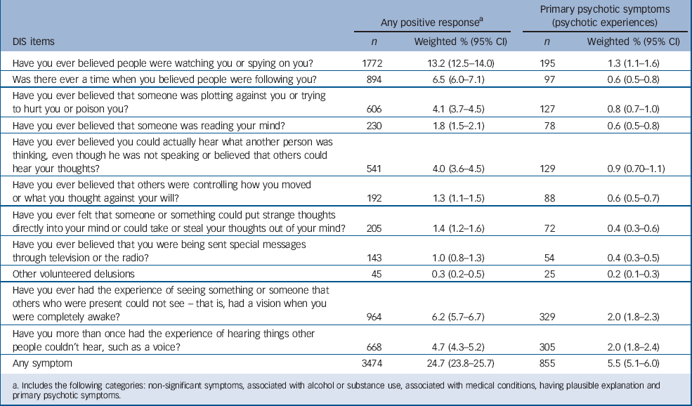 | Any positive response a | Primary psychotic symptoms (psychotic experiences) |