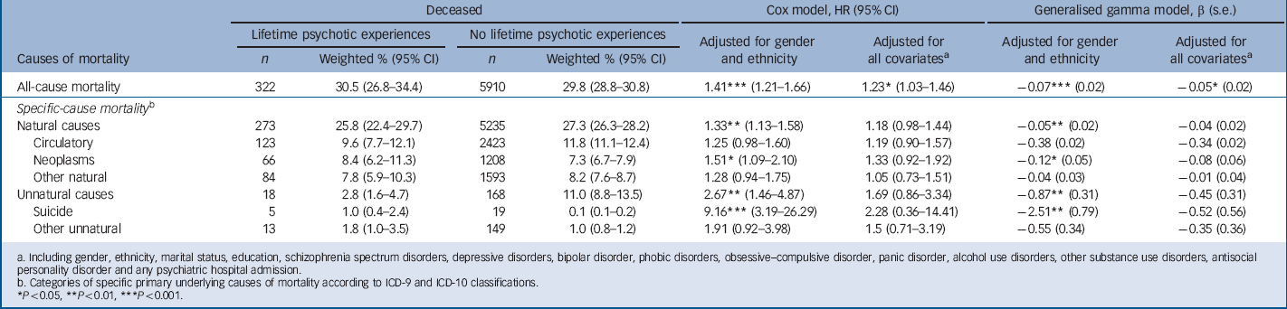 Table 2 Association of lifetime psychotic experiences with all-cause and specific causes of mortality adjusted for the covariates examined by Cox proportional hazard and generalised gamma models in 15 049 participants