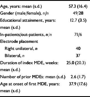 The sample was recruited from patients with major depressive episode diagnosed on the basis of a structured interview (Reference Ventura, Liberman and GreenVentura et al, 1998). Written informed consent was obtained after a complete description of the study had been given to the participants, and the protocol was approved by the local institutional review board. Participants were at least 18 years old, with no history of schizophrenia or schizoaffective disorder, active substance misuse, learning disability or neurological illness; their Mini-Mental State Examination (MMSE; Reference Folstein, Folstein and McHughFolstein et al, 1975) scores were 18 or over. No patient had received ECT during the previous 4 months. Baseline scores on the 21-item Hamilton Rating Scale for Depression (HRSD; Reference HamiltonHamilton, 1960) were 20 or over. The adequacy of antidepressant drug therapy during the current major depressive episode was determined using a dichotomised rating scale (adequate treatment ν. inadequate treatment) (Reference Prudic, Haskett and MulsantPrudic et al, 1996; Reference McCall, Cohen and ReboussinMcCall et al, 1999a ; Reference SackeimSackeim, 2001). Antidepressants, anticonvulsants and lithium were discontinued prior to the first ECT session and benzodiazepines were tapered to 4 mg or less per day of lorazepam or its equivalent. Participants received open treatment with antidepressant medication during the month-long period of observation after ECT, with the choice of medication determined by the attending physician.