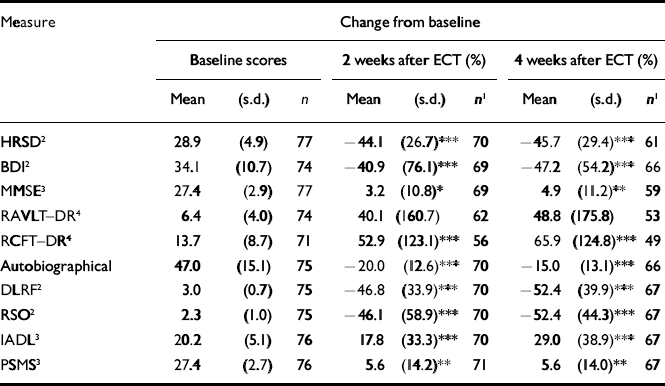 | Baseline scores | 2 weeks after ECT (%) | 4 weeks after ECT (%) | |||||||