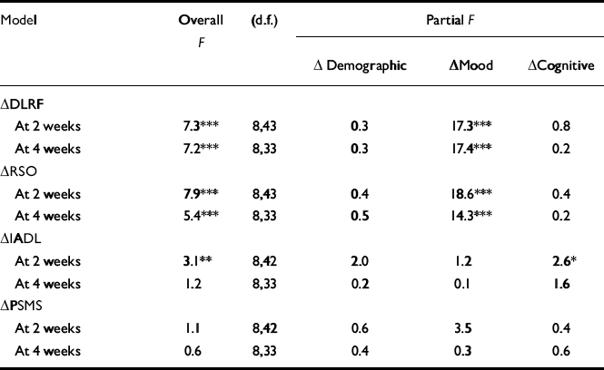 All of the models of the change in DLRF and RSO scores were highly significant, and mood was the only significant block variable (Table 3). Fractionation of the ‘mood’ block revealed that only the HRSD was statistically related to DLRF or RSO when the HRSD and BDI measures were both present in the models. Reductions in depression severity were associated with reductions in deficits in DLRF and RSO.