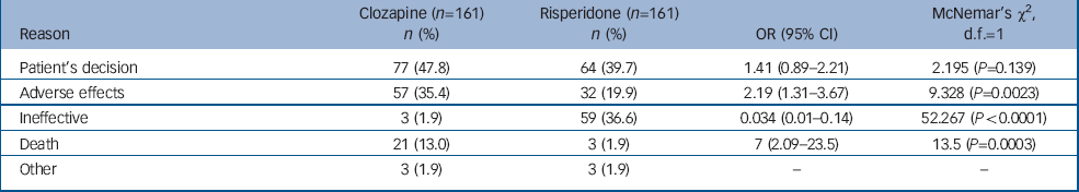 | Reason | Clozapine (n=161) n (%) | Risperidone (n=161) n (%) | OR (95% CI) | McNemar's χ2, d.f.=1 |