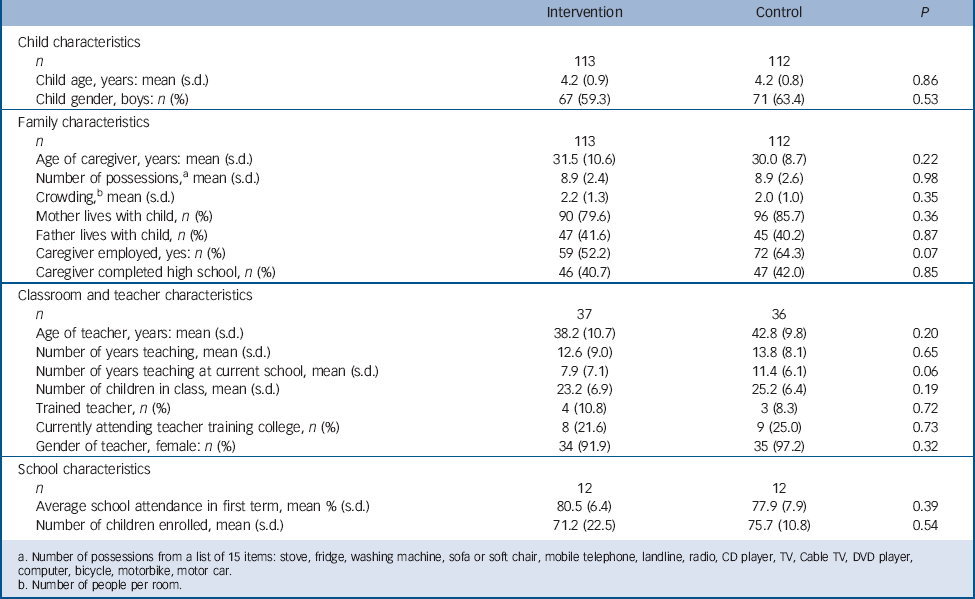 Within each class, three children were observed for 5 min each on a rotational basis for a total of 15 min each day per child over 4 days, across different times of the school day giving a total of 1 h of observation. Event recording was used to count aggressive/destructive behaviours (e.g. hitting, pushing, throwing objects) and friendship skills (e.g. sharing, working together) and expressed as frequency per hour. Instantaneous sampling (i.e. recording whether or not the behaviour was present at each sample point) was used to code disruptive behaviours (e.g. shouting, out of seat) at 15 s intervals, with a maximum possible score of 240. The aggressive/destructive and disruptive behaviours chosen were based on the Dyadic Parent–Child Interaction Coding System (DPICS) Reference Eyberg and Robinson15 and Multi-Option Observation System for Experimental Studies (MOOSES) Reference Tapp, Wehby and Ellis16 behaviour categories, operationalised for the Jamaican pre-school context. All behaviours were defined in a manual. At the end of each 5 min observation period, observers rated the frequency of conduct problems, activity level, on-task behaviour and follows rules/expectations of the classroom using seven-point rating scales (with behavioural descriptors on each point of the scale). Higher scores indicate higher levels of the behaviours.