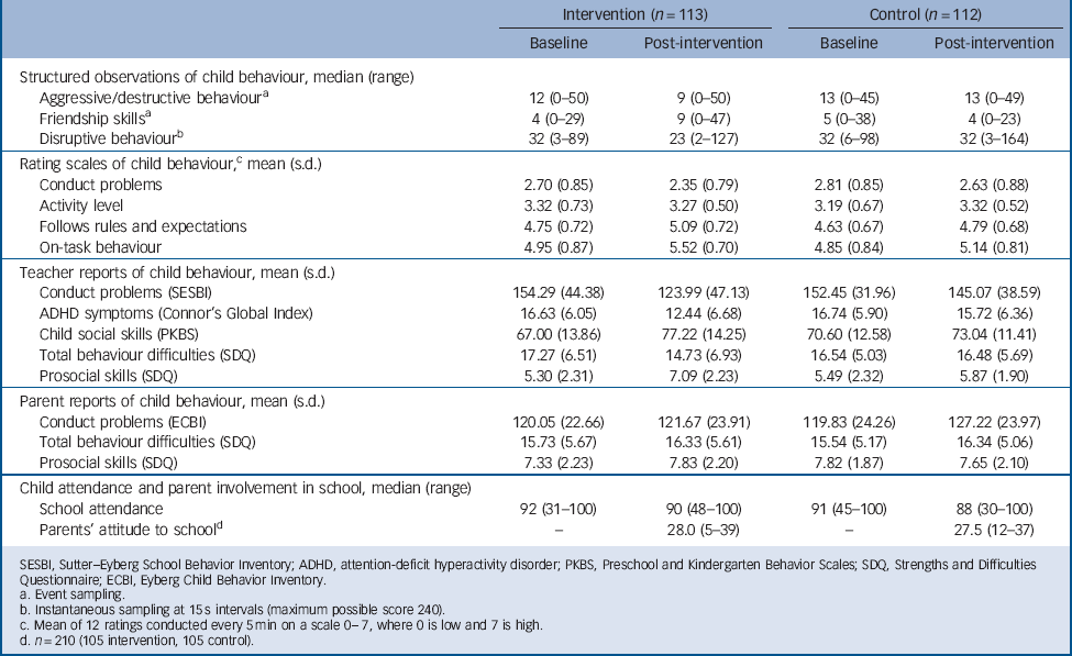 For teacher-reported child behaviour, we used the Sutter–Eyberg Student Behavior Inventory (SESBI) Reference Rayfield, Eyberg and Foote17 to measure child conduct problems, Connor’s Global Index Reference Kollins, Epstein, Conners and Maruish18 to measure hyperactivity and attention difficulties, the Strengths and Difficulties Questionnaire (SDQ) Reference Goodman19 to measure behaviour difficulties and prosocial skills, and the Preschool and Kindergarten Behavior Scales (PKBS): Social Skills Scale Reference Merrell20 to measure social skills. For parent-reported child behaviour, we used the Eyberg Child Behavior Inventory (ECBI) Reference Eyberg and Ross21 to measure child conduct problems, and the SDQ Reference Goodman19 to measure behaviour difficulties and prosocial skills.