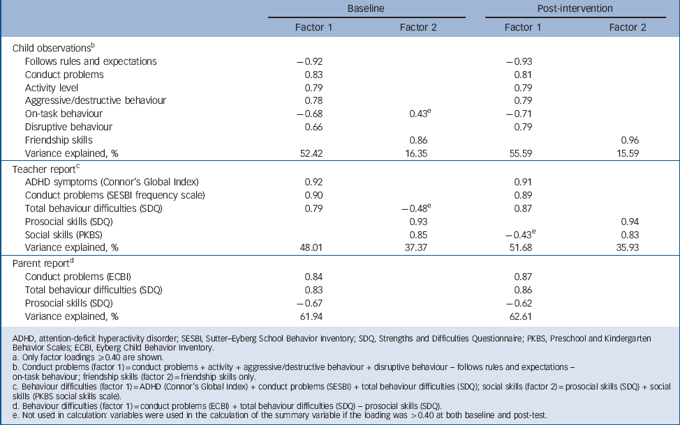 TABLE 3 Factor analyses of observations of child behaviour and teacher and parent reports of child behaviour at baseline and post-intervention a