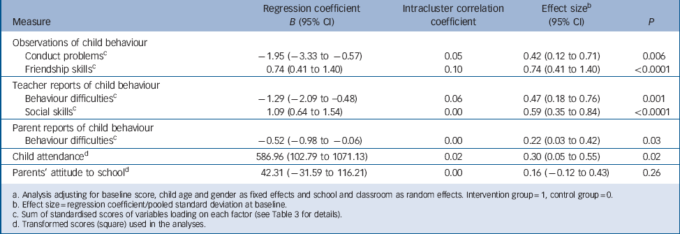 TABLE 4 Effect of intervention on child behaviour through independent observations and teacher and parent report and on child attendance and parent attitude to school a
