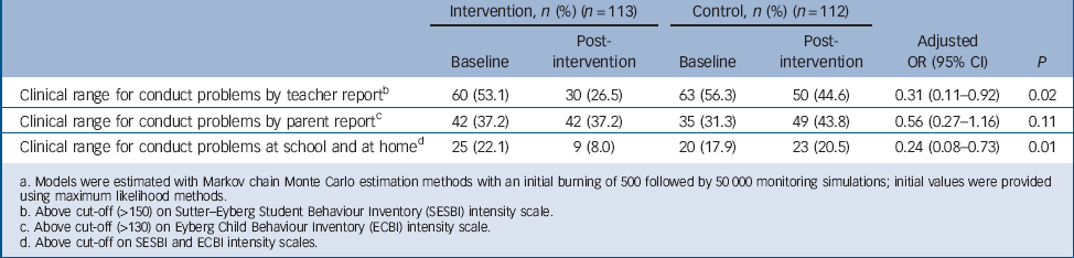 Intervention led to significant benefits in observed child behaviour (Table 4), with reductions in conduct problems (effect size (ES) = 0.42) and increased friendship skills (ES = 0.74). Significant benefits were also found for teacher-reported child behaviour difficulties (ES = 0.47) and social skills (ES = 0.59), and parent-reported child behaviour difficulties (ES = 0.22). There were significant benefits for child attendance (ES = 0.30) but not for parents’ attitude to school (ES = 0.16, P = 0.26). A similar proportion of children from both groups were rated as being in the clinical range for conduct problems by teachers and parents at baseline (Table 5). Children in the intervention group were less likely to be rated in the clinical range by teachers at post-test and were less likely to have pervasive conduct problems (Table 5). There was no significant change in the proportion of children scoring in the clinical range by parent report.