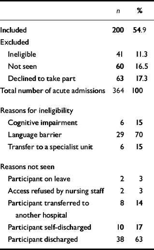 During the study period there were 364 acute psychiatric admissions according to computerised records. Two hundred individuals (76% of those eligible) consented to take part in the study. Reasons for not taking part in the study are described in Table 1.