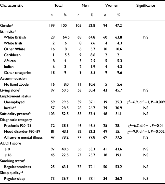 Table 3 shows associations between participants' demographic characteristics and psychiatric diagnoses and their AUDIT scores. Ninety-seven participants (48.5%) had an AUDIT score of 8 or more, indicating hazardous or harmful alcohol use (‘AUDIT positive’). The AUDIT positive participants tended to be younger than the AUDIT negative ones (Mann–Whitney U test: z=–2.97, P=0.003), and were more likely to be White than from other ethnicities. Men and women were equally likely to be AUDIT positive. The AUDIT positive participants did not differ from the AUDIT negative ones on other significant variables: the proportion with psychosis (ICD–10, F20–29.9), any mood disorder (ICD–10, F30–39) or severe mental illness; the proportion of those with no fixed abode or living alone; the proportion who were unemployed or sick/disabled.