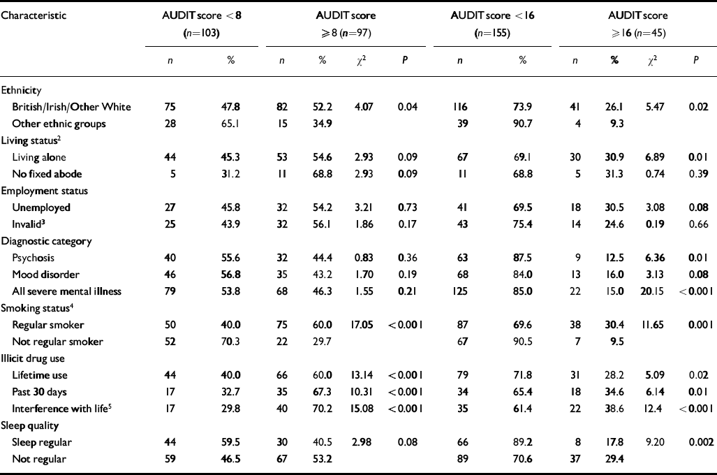 Forty-five participants (22.5%) had AUDIT scores of 16 or more, indicating significant alcohol dependence. Again, equal numbers of men and women scored at this level (27 men, 28 women; χ2=1.22, d.f.=1, P=0.27). They were almost exclusively White (British or Irish) rather than from other ethnic groups. Compared with other participants they were more likely to be living alone. They were less likely to be diagnosed with a schizophreniform psychosis or severe mental illness (ICD–10, F20–29) than those with lower scores.