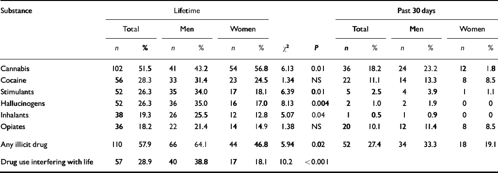 Self-reported illicit drug use is detailed in Table 4. Fifty-seven participants (28.9%) felt that their substance use had interfered with work, social or home life in the previous year. Overall, men were more likely to have used drugs than women. Lifetime drug use was not associated with psychosis in this sample (χ2=0.572, d.f.=1, P=0.351). Individuals reporting lifetime drug use were younger than other participants (Mann–Whitney U test: z=–6.06, P<0.001) and had shorter psychiatric histories (Mann–Whitney U test: z=–1.99, P=0.045).