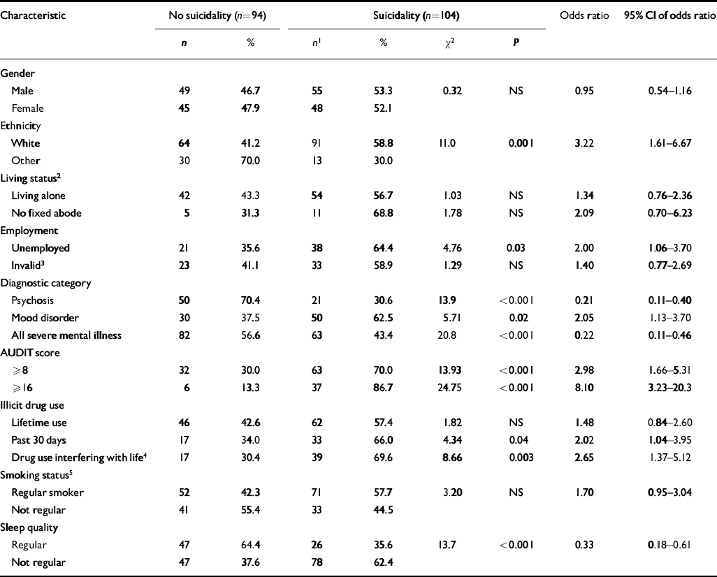 | Characteristic | No suicidality (n=94) | Suicidality (n=104) | Odds ratio | 95% CI of odds ratio | ||||