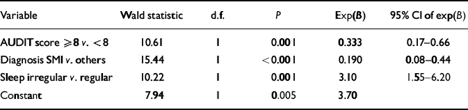 Logistic regression was carried out to ascertain which factors were independently associated with suicidality in this sample. In addition to gender, variables associated with alcohol use disorders according to AUDIT score or with suicidality at a level of P<0.05 were entered into the logistic regression. Age was entered as a continuous variable. The following were entered as dichotomous variables: audit score (8 or more v. less than 8), gender, employment status (unemployed/other groups), ethnicity (White/other groups), living alone, diagnostic category (severe mental illness/other diagnostic groups), lifetime use of illicit drugs, illicit drug use in the previous 30 days, sleep quality and whether a regular smoker. Significant predictors of suicidality are listed in Table 6. The regression indicates that the AUDIT score, irregular sleep pattern and not having a severe mental illness were significant predictors of suicidality (i.e. once controlled for age, gender and the other variables listed above). Similar results are obtained if the AUDIT score is entered as a continuous variable.