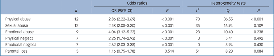 In stage two we examined associations between specific adversity subtypes and bipolar disorder. Table 1 shows the results of the analyses exploring whether specific types of childhood adversity are elevated in bipolar disorder. Grandin et al and Neeren et al both reported analyses from the Longitudinal Investigation of Bipolar Spectrum Disorders project; Reference Grandin, Alloy and Abramson31,Reference Neeren, Alloy and Abramson49 we selected information from the paper by Neeren et al because it specifically reported effects pertaining to the impact of adversity subtypes. The results of these separate meta-analyses showed significant effects of all childhood adversity subtypes, with the exception of parental loss, on bipolar disorder. Emotional abuse showed the strongest effect (OR = 4.04, 95% CI 3.12–5.22, P<0.001).