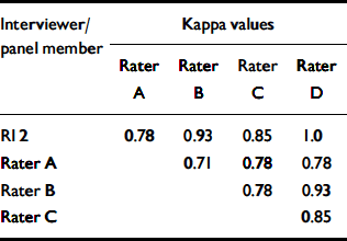 ▪ The measure reported for assessing agreement between two interviewers is effectively a hybrid of interrater and test–retest reliability and may yield lower kappa values than would be expected from a measure of pure interrater reliability.