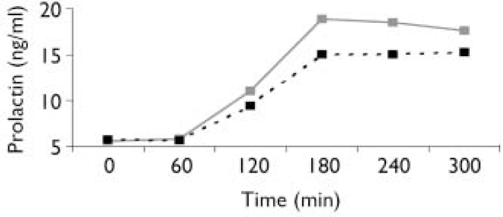 Following the clinical evaluation and prior to the day of the challenge protocol, participants followed a low monoamine diet for 3 days and reported to the laboratory at 08.00 h after fasting overnight. An indwelling catheter was inserted into a forearm vein. Following an adaptation period, baseline blood samples were drawn at 09.45 h and 09.55 h. At 10.00 h, a 1 mg/kg dose of d,l-fenfluramine hydrochloride was administered orally. Blood samples were drawn 60, 120, 180, 240 and 300 min later for determination of plasma prolactin, fenfluramine and norfenfluramine concentrations. All samples were placed on ice prior to centrifugation (within 2 h). After separation, samples were frozen at –80° C until analysis. The lower limit of detection for the prolactin assay is <1.0 ng/ml. Intra- and interassay variability are less than 6.7% and 8.4% respectively. Blood samples for determination of plasma fenfluramine and norfenfluramine were drawn hourly. After separation, these samples were frozen at –20° C prior to assay by gas chromatography with electrical detection. The lower limit of sensitivity for these assays is 2 ng/ml for fenfluramine and 3 ng/ml for norfenfluramine. Intra- and interassay variability for the two assays are less than 7%. Participants remained awake and fasting during the entire procedure, reclining in a bed and watching videotapes. All fenfluramine studies were completed prior to September 1997.