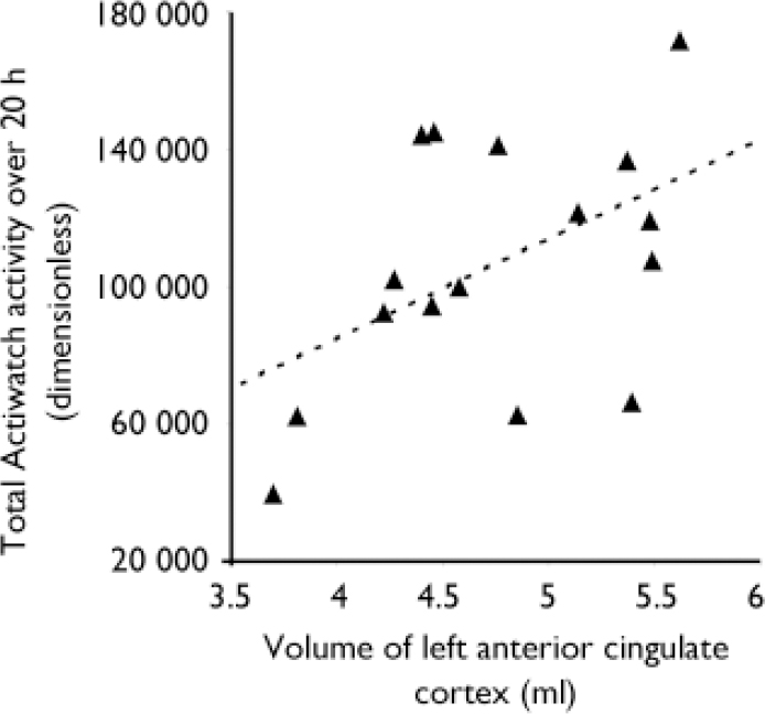 Fig. 1 Positive correlation in 16 patients with chronic schizophrenia between their total cumulative activity over 20 h and left anterior cingulate cortex (Brodmann area 32) volumes.