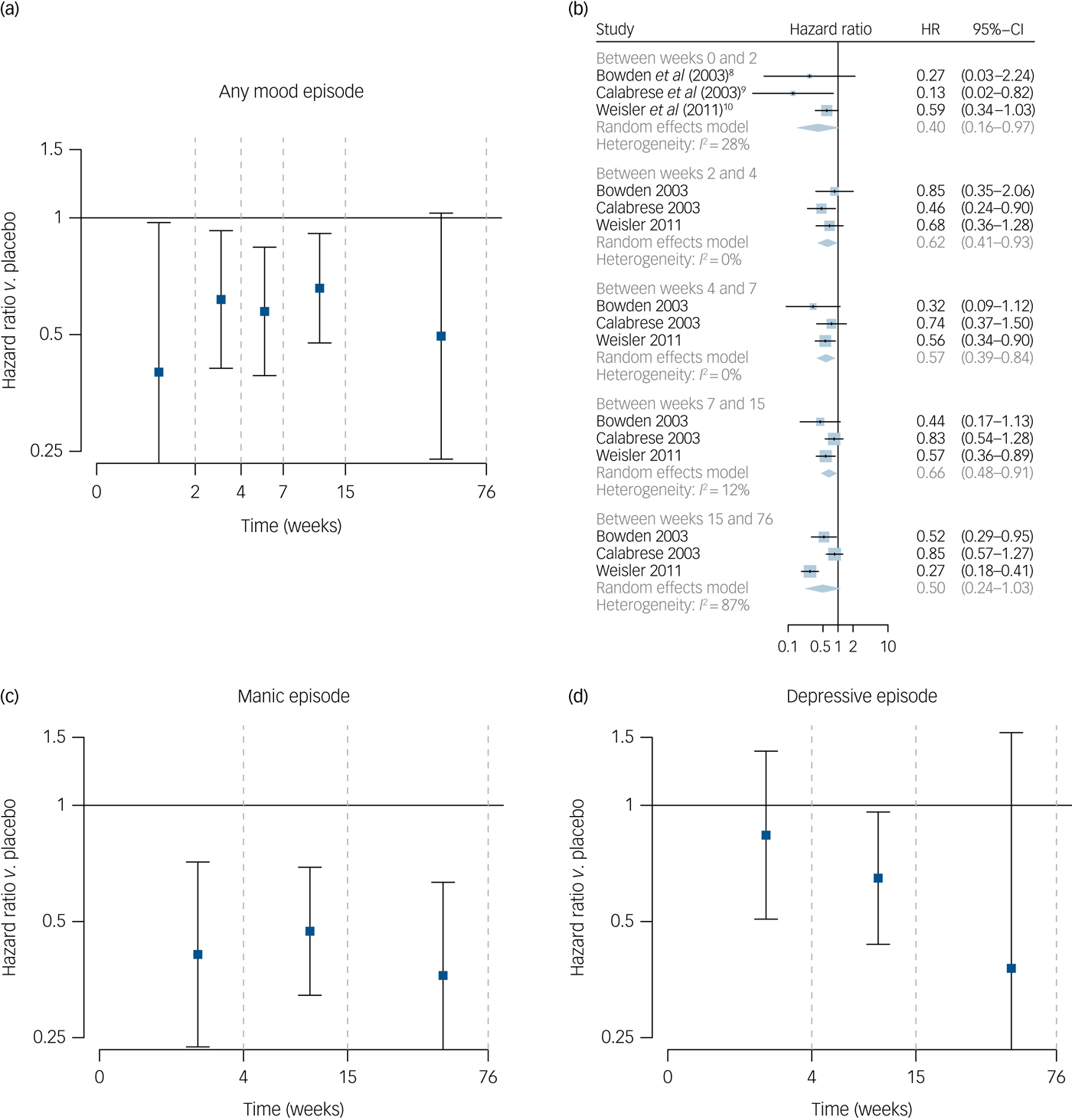 For risk of manic relapse, risk was lower in those randomised to receive lithium between baseline and week 4, HR = 0.41 (95% CI 0.24–0.73), with a similar effect between week 4 and week 15, HR = 0.47 (95% CI 0.32–0.69) and between week 15 and week 76 (HR = 0.36, 95% CI 0.21–0.63) (Fig. 1(c)).