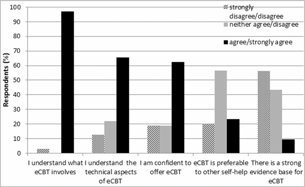 As shown in Fig. 1, almost all participants (97%) reported that they ‘know what eCBT involves’. Most (65%) were ‘comfortable with the technical aspects of eCBT’, and slightly fewer (62%) were ‘confident to offer eCBT to clients’. About one-quarter of participants (23%) thought that ‘eCBT is preferable to other forms of self-help’, with over half of the sample (56%) neither agreeing nor disagreeing with this statement. Only about 10% of participants ‘agreed’ or ‘strongly agreed’ that ‘there is a strong evidence base to support the use of eCBT’.