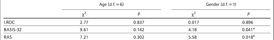All three questionnaires were tested using the Kolmogorov-Smirnov test for normality, which showed that both I.ROC and BASIS-32 were normally distributed (D 170 = 0.129, P = 0.200), but RAS was significantly non-normal (D 170 = 0.073, P<0.05). Therefore comparisons between measures were carried out with non-parametric tests.